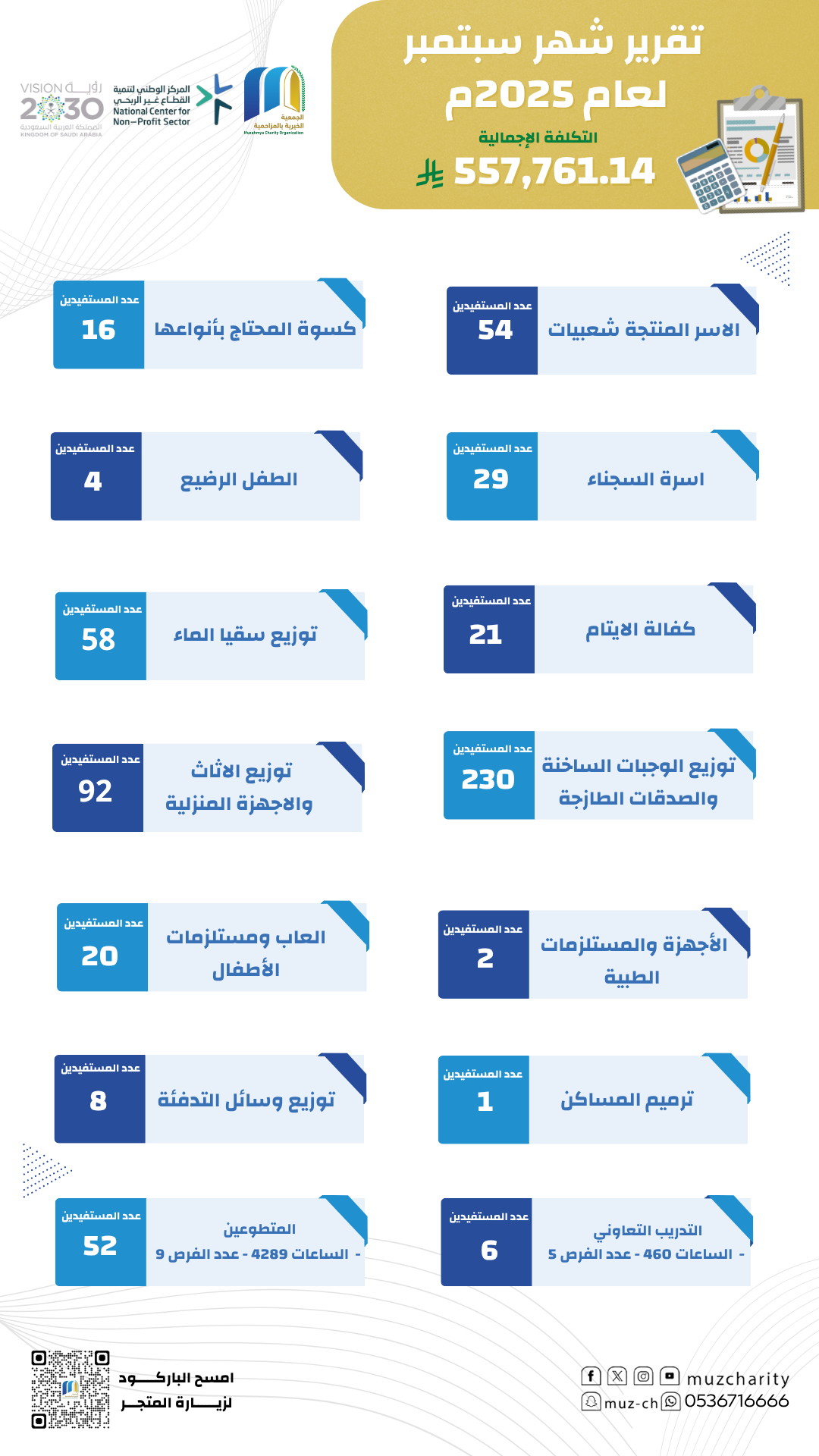 ضمن جهودها المستمرة في تعزيز العمل الخيري وتحقيق التنمية الاجتماعية، استعرضت الجمعية الخيرية بمحافظة المزاحمية تقريرها الشهري لشهر سبتمبر 2025م، والذي بلغت تكلفته الإجمالية 557,761.14 ريالًا، واستفاد منه مئات الأسر والأفراد في مختلف البرامج والمشاريع الإنسانية.